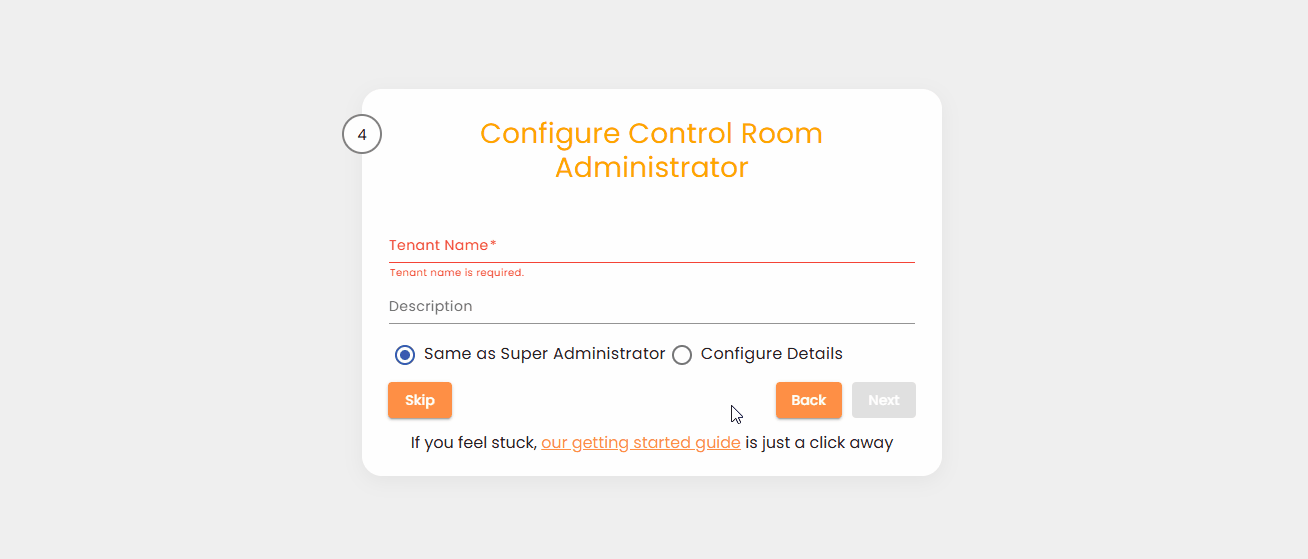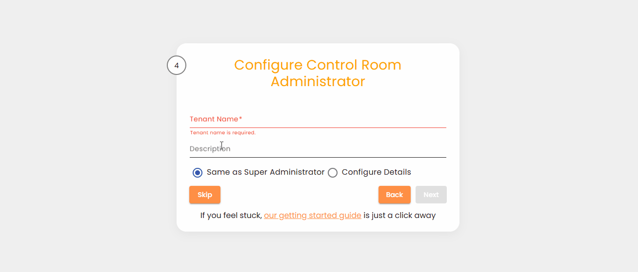 - If you prefer to configure the AI Command Center Administrator at a later stage, you may click Skip and continue with the remaining setup steps.