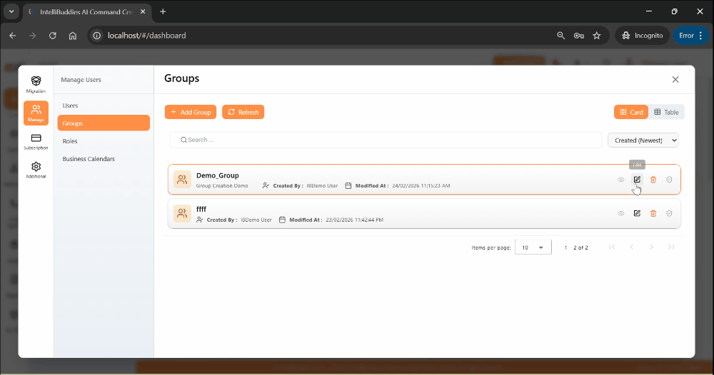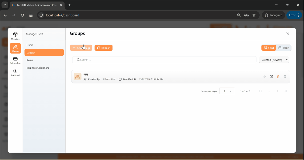 A Group represents a collection of users who share responsibilities, roles, or workflow participation within the AI Command Center.