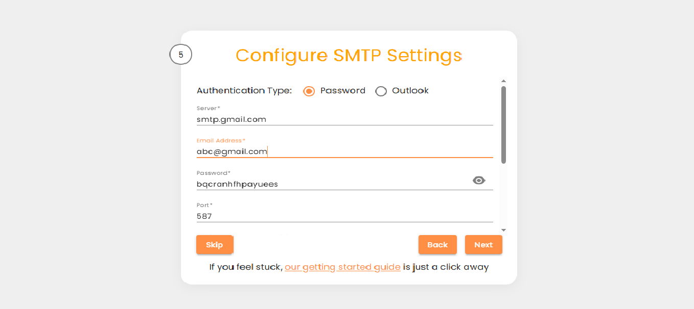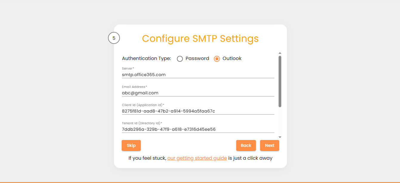 - If you prefer to configure SMTP at a later time, click Skip to continue with the setup process.