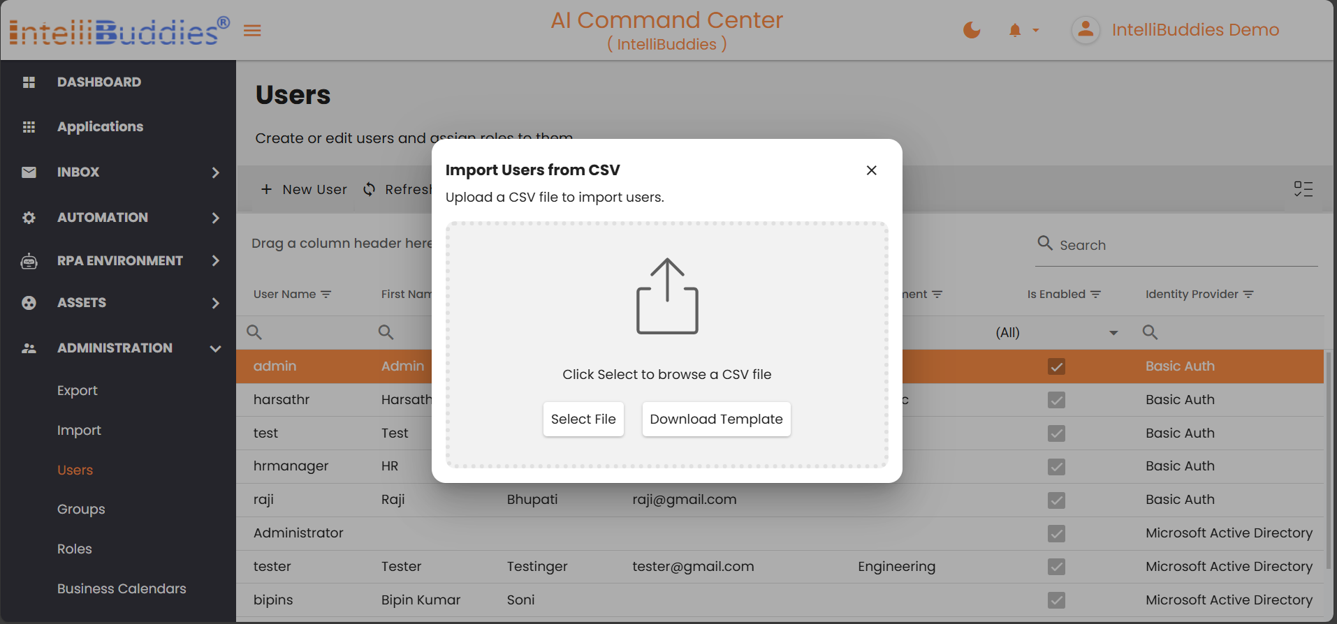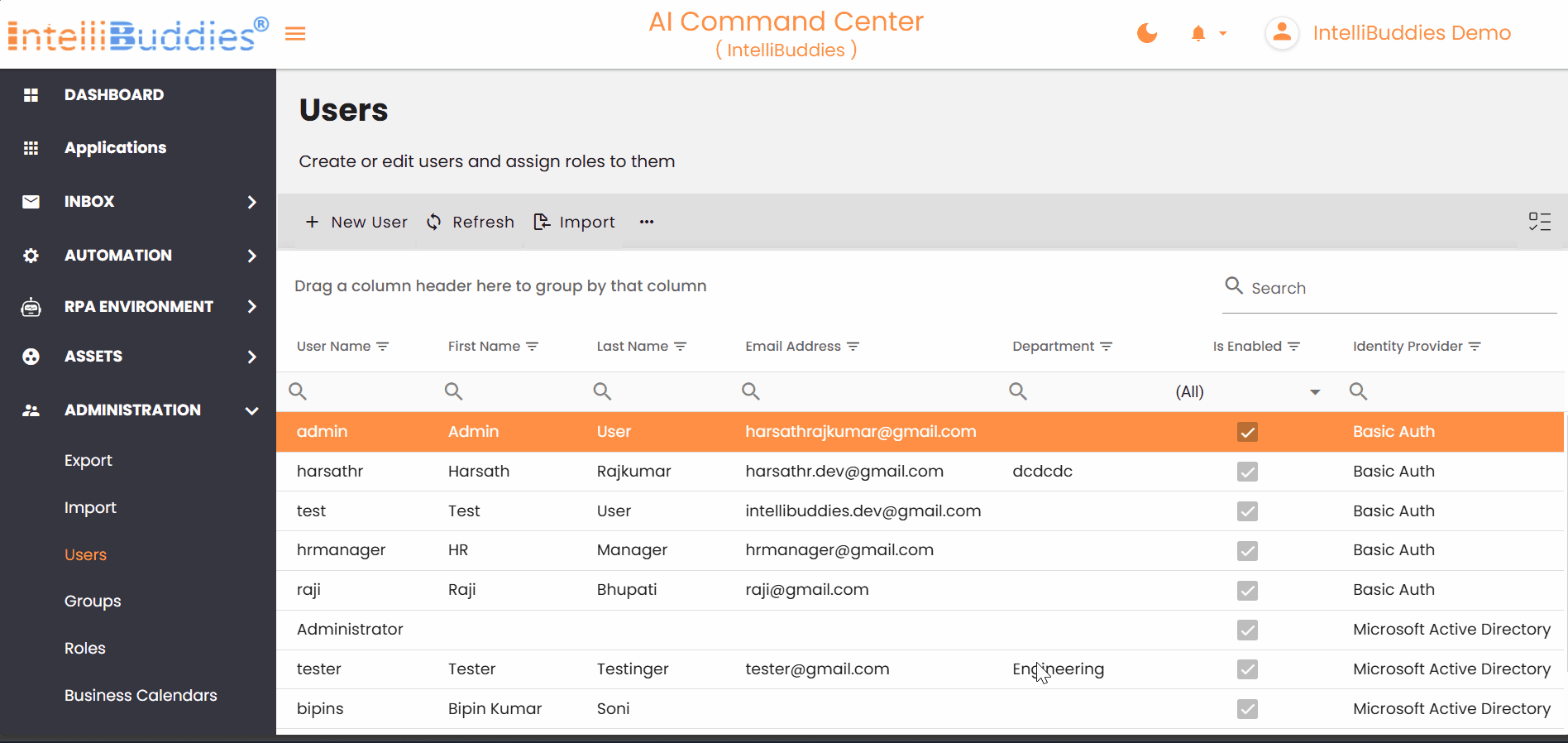 You can manage users from Administration > Users. The Users page displays all users available to the system, regardless of how they were sourced.