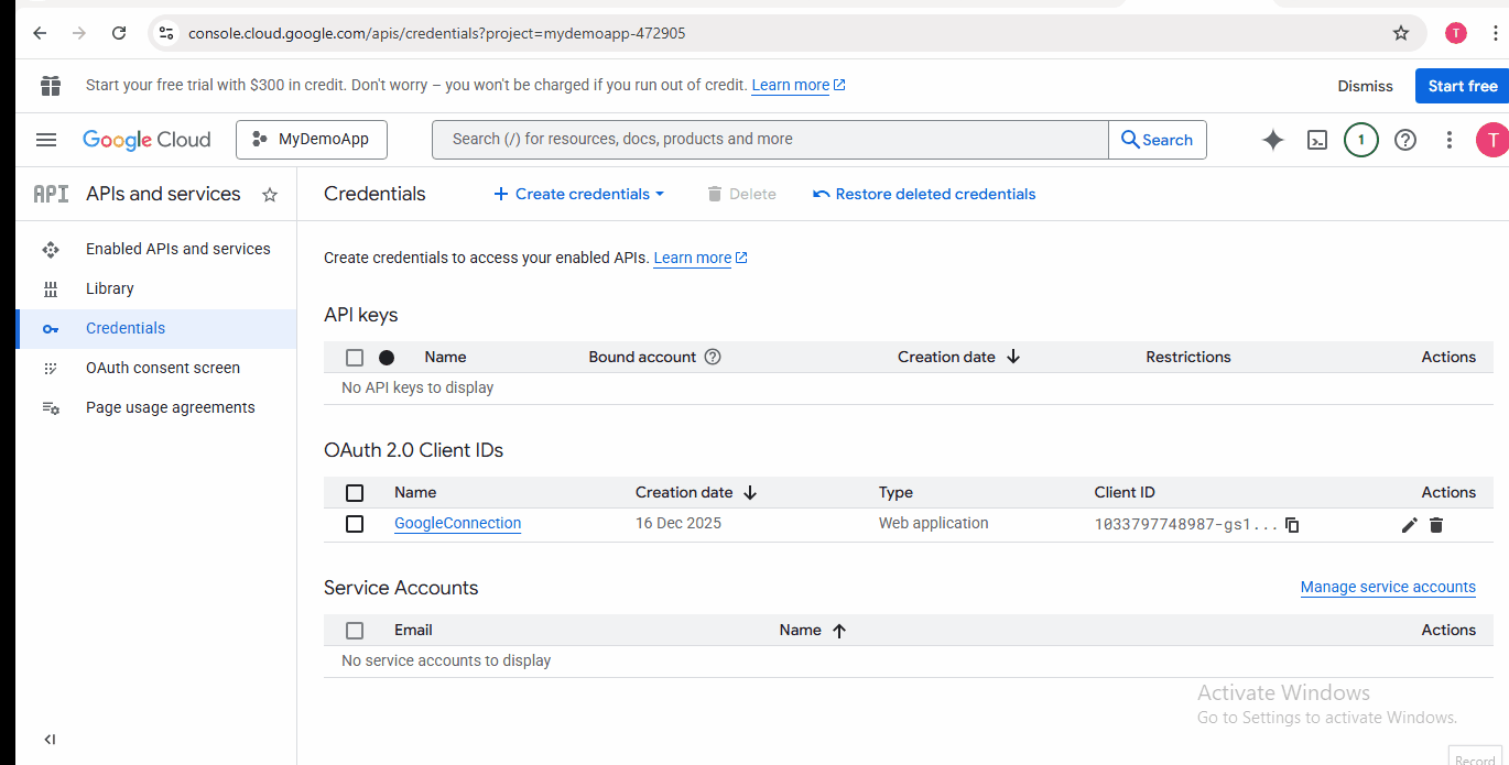 - Click + Create Credentials and select a credential type - API key - OAuth client ID. - Service account